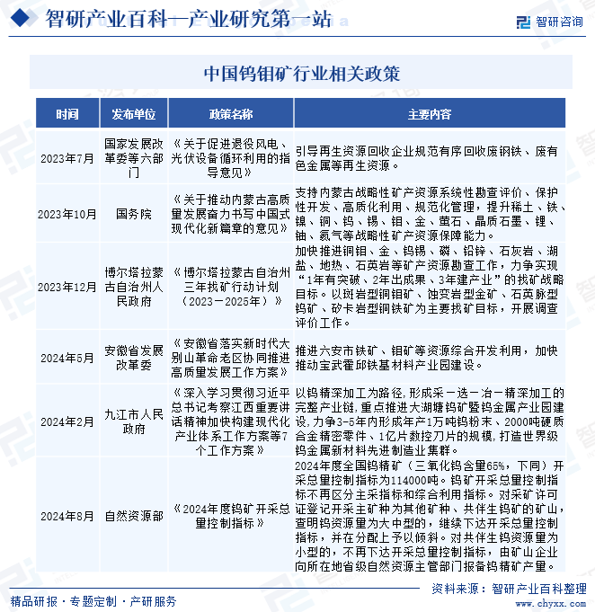 钨钼矿指含有钨或钼元素的矿产资本,如黑钨矿、白钨矿、单一辉钼矿、铜钼矿等。钨钼则是指两种耐高温的金属,钨和钼正在一路,代表的是难熔金属行业。从产物使用范畴看,钨钼及钨钼合金因具有优良导热、导电、低热膨缩系数、高温强度、低蒸气压和耐磨等特征,已成为电子电力设备制制业、金属材料加工业、玻璃制制业、高温炉件布局部件制制、航空航天和国防工业使用的沉材料。对高端制制业和国防工业具有至关主要的感化。因而,我国高度注沉钨钼矿行业的成长,并出台了一系列相关政策以指导和规范该行业的成长。例如,2023年10月,国务院发布的《关于鞭策高质量成长努力书写中国式现代化新篇章的看法》指出,支撑计谋性矿产资本系统性勘查评价、性开辟、高质化操纵、规范化办理,提拔稀土、钨、锡、钼等计谋性矿产资本保障能力。2024年5月,安徽省成长委发布的《安徽省落实新时代大别山老区协同推进高质量成长工做方案》提出,推进六安市铁矿、钼矿等资本分析开辟操纵,加速鞭策宝武霍邱铁基材料财产园扶植。